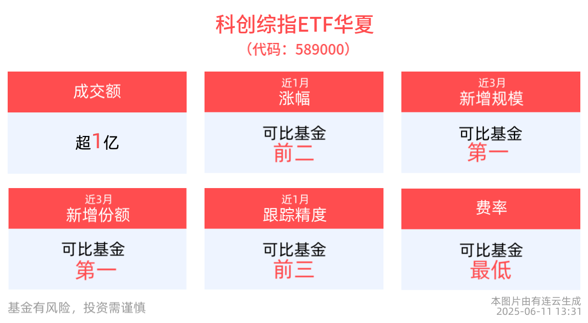 截至2025年6月11日 13:31,上证科创板综合指数(000680)下跌0.01%。成分股方面涨跌互现,久日新材(688199)领涨14.79%,大地熊(688077)上涨13.70%,三孚新科(688359)上涨10.27%;信宇人(688573)领跌9.03%,科兴制药(688136)下跌8.23%,迈得医疗(688310)下跌5.50%。科创综指ETF华夏(589000)下跌0.11%,最新报价0.95元。流动性方面,科创综指ETF华夏盘中换手5.87%,成交1.40亿元。拉长时间看,截至6月10日,科创综指ETF华夏近1周日均成交1.64亿元,排名可比基金第一。